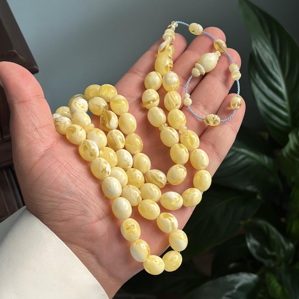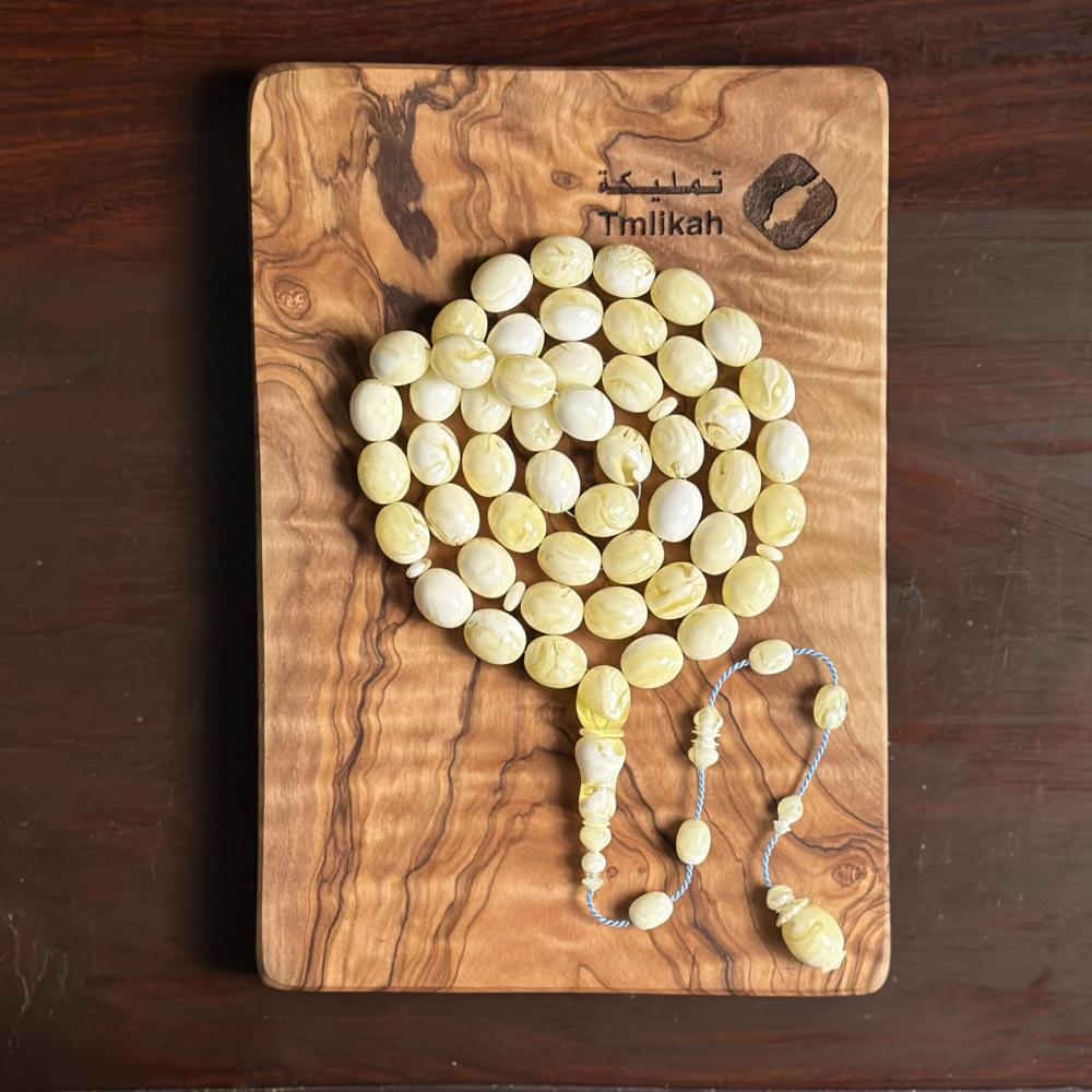 مسباح مستكه بدون رائحة بلون كهرماني جميل بتعريق بطقم عربي منتهي بتمليكة ، خراطة ورشة محمود فارس