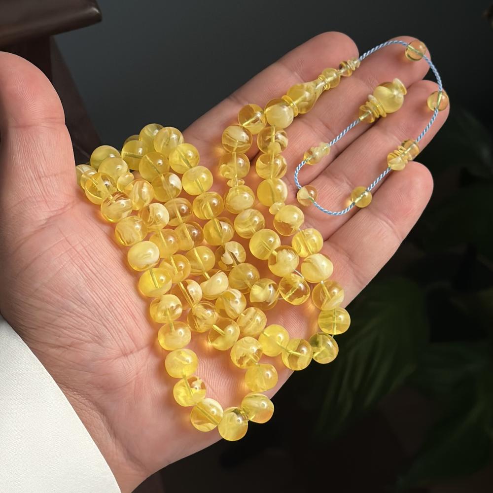 مسباح مستكه بدون رائحة بلون اصفر شفاف بتلطيخ شبيه الكهرمان الطبيعي منتهي بتمليكة خراطة ورشة محمود فارس